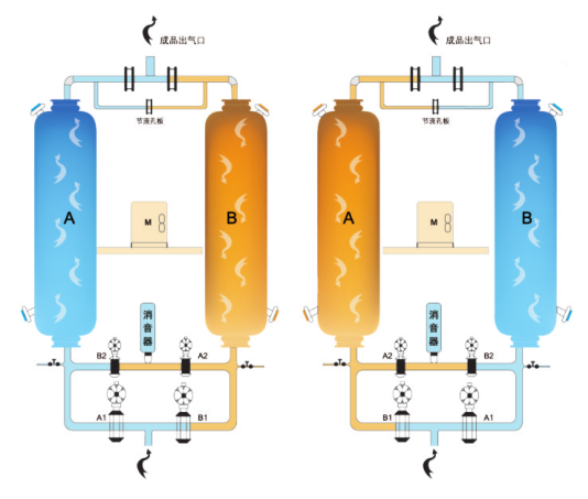 無熱再生吸附式干燥機以變壓吸附為基礎,在混合組分中的水蒸氣高分壓時吸附劑吸附水分,而在水蒸氣低分壓環境中,吸附劑中所 吸附的水分完成“ 解吸”并重返氣相,吸附劑因此而獲得活性再生。無熱再生干燥機所用的低分壓解吸空氣取自本機輸出的一部分成品氣,再生氣與成品氣同源給無熱再生吸附式干燥機帶來很大的便利,使其結構變得十分簡單,操作過程也很方便。在無熱再生工藝 中,解吸氣不僅是再生所必需的能源,而且還兼作水蒸氣排出的截體。由于變壓吸附在一般情況下均視作等溫過程, 所以無熱再生干燥機不需要另設冷卻工序,吸附劑的解吸與再生在無熱再生中是同步完成的。